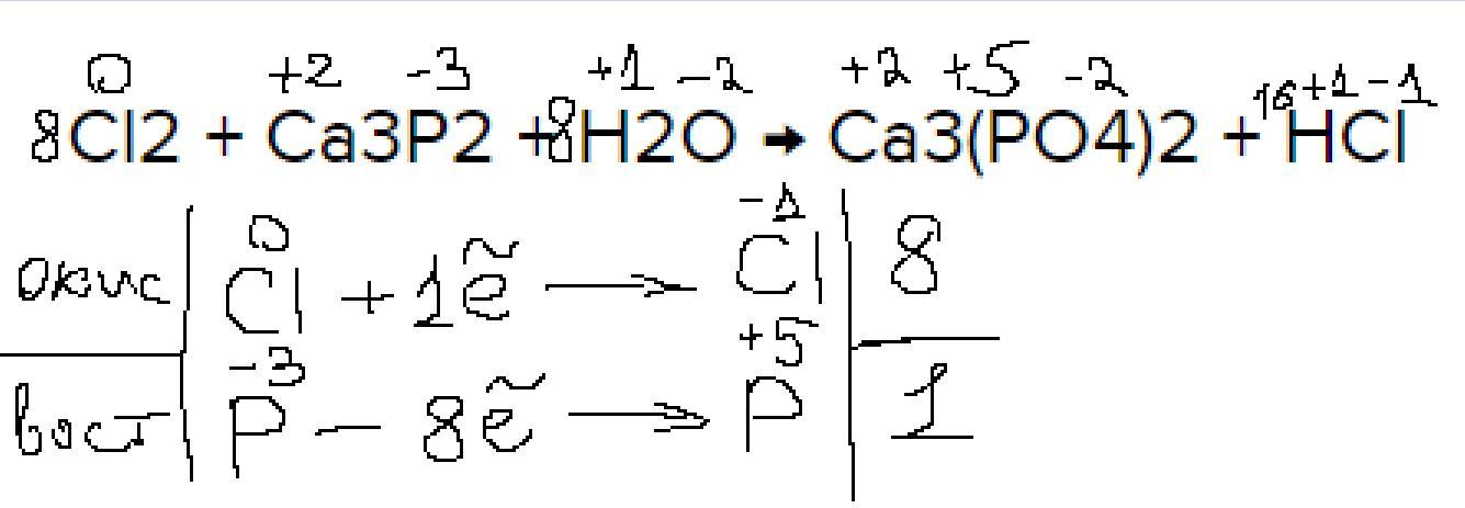 Используя метод электронного баланса, расставьте коэффициенты в уравнении реакции, схема которой Cl2 + Ca3P2 + H2O → Ca3(PO4)2 + HCl Определите окислитель и восстановитель.