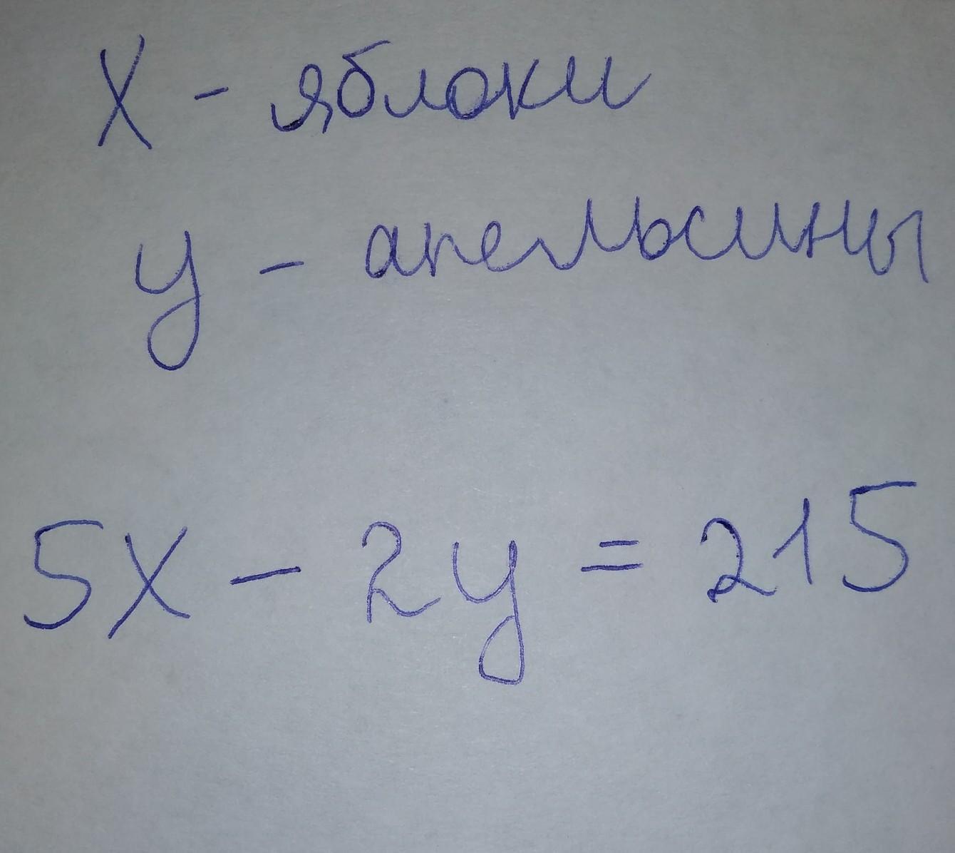 составьте линейное уравнение с двумя переменными по условию задачи:5кг яблок дороже 2кг апельсинов на 2р. 15 коп.