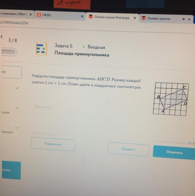 Ответ: S = AB*AD = √5*√20 = √100 = 10 см².