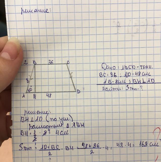 Пояснення:AH = 4, BH = 4 корень из 3.S = 42 * 4 корень из 3 = 168 корень из 3