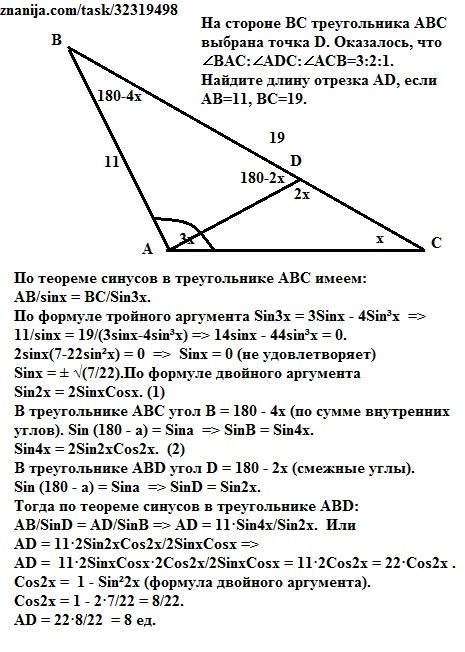 На стороне BC треугольника ABC выбрана точка D. Оказалось, что ∠BAC:∠ADC:∠ACB=3:2:1. Найдите длину отрезка AD, если AB=11, BC=19.