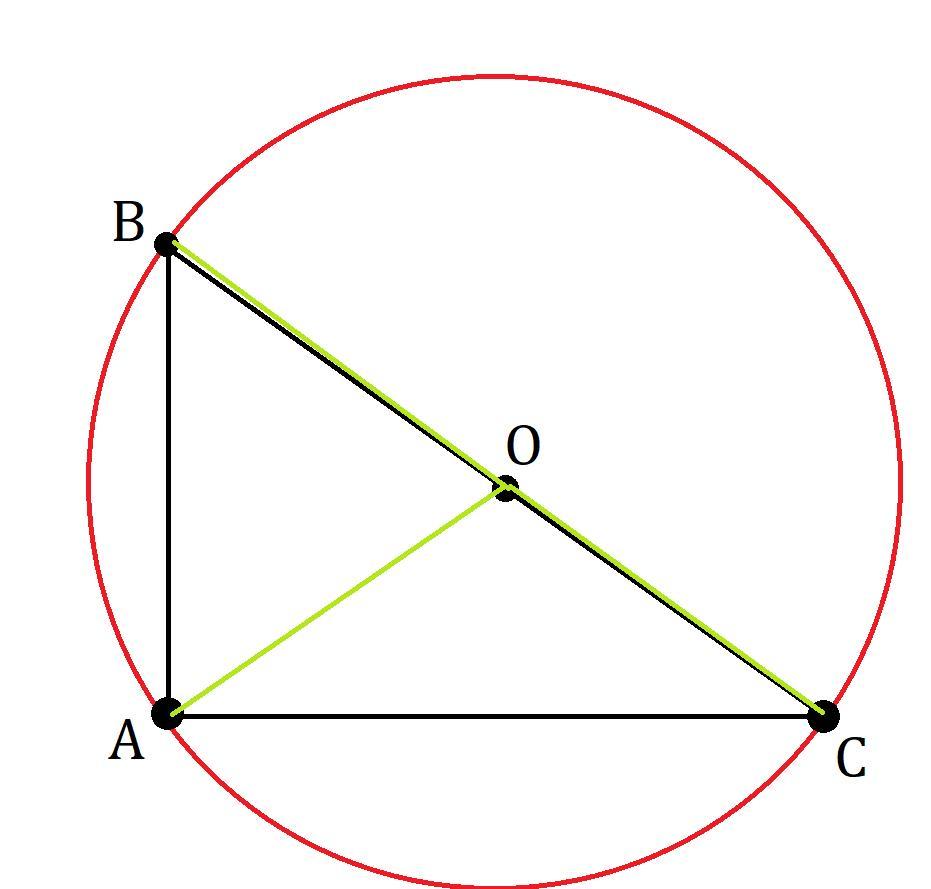 Вокруг любого треугольник можно описать окружность, опишем окружность с центром O. ∠BOC=2*∠BAC как центральный и вписанный угол опирающиеся на одну и ту же дугу. Значит ∠BOC=180°, то есть это прямая, так же дуга BC это половина окружности, значит BC это деаметр и поэтому точка O лежит на этой прямой. BO=OC т.к. O это центр, так же BO=R=OC, где R-радиус окружности т.к. радиус описанной окружности это расстоянии от центра окружности до вершины, таким же образом AO=R, а значит