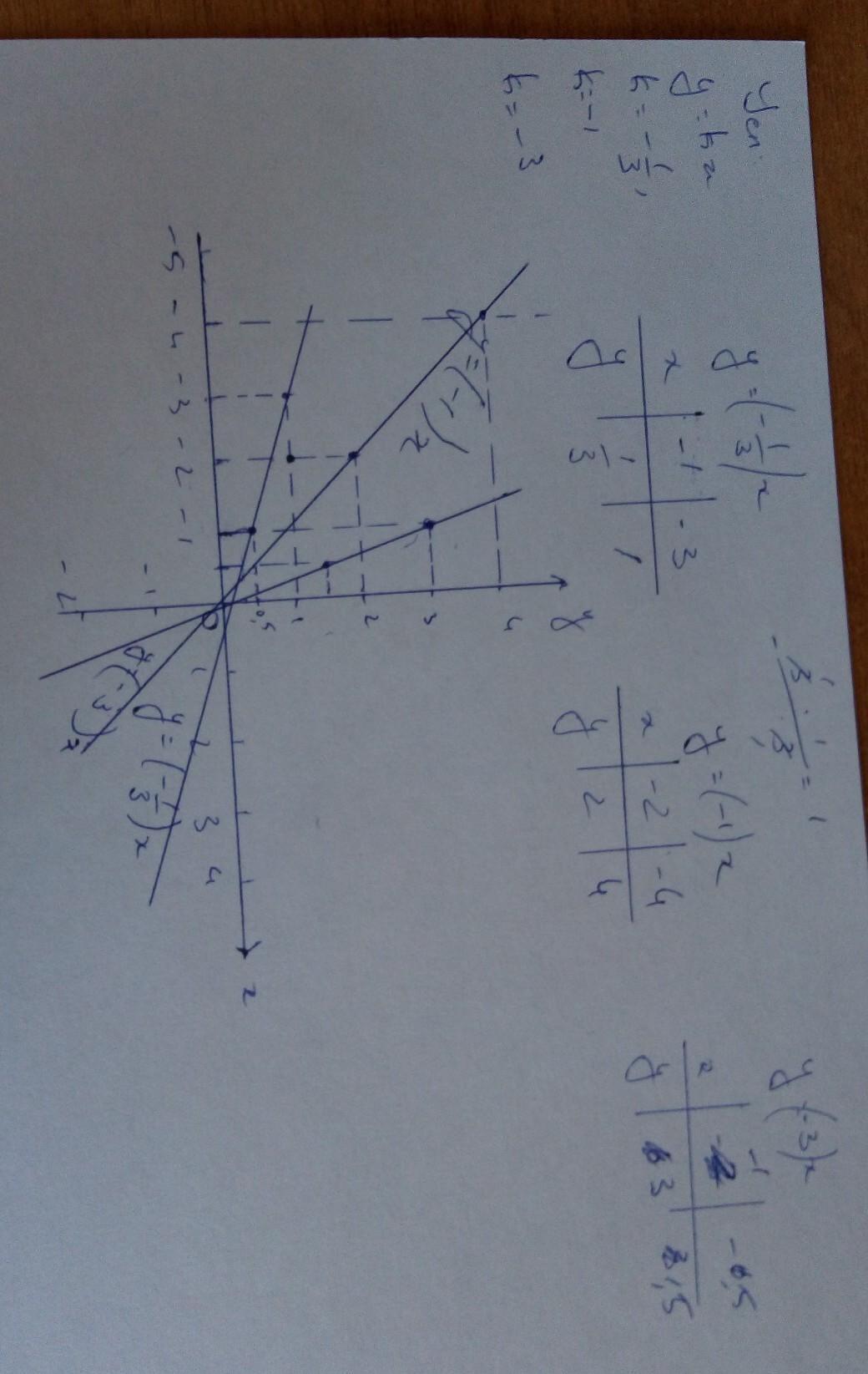 Построй на одной координатной плоскости графики зависимости y=kx, если k=-1/3, k=-1 и k=-3. Объесните как это делать.
