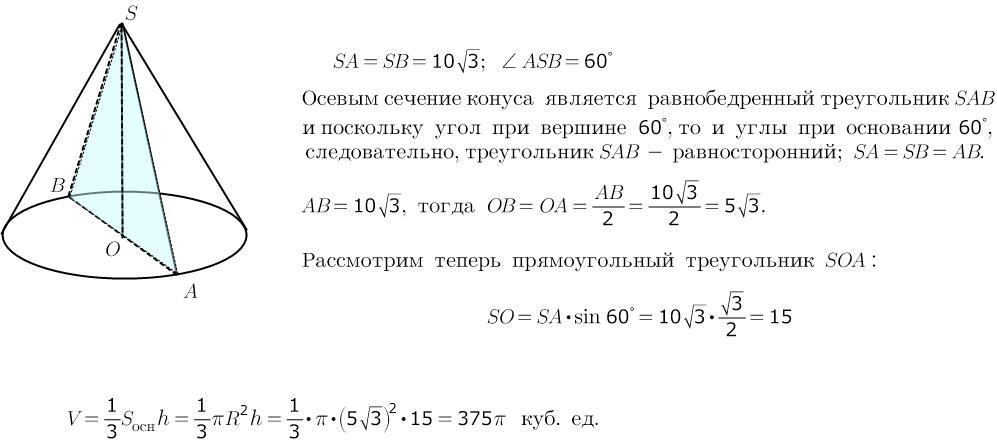 Найдите объем конуса, образующая которого равна 10√3 и угол при вершине осевого сечения равен 60 градусов