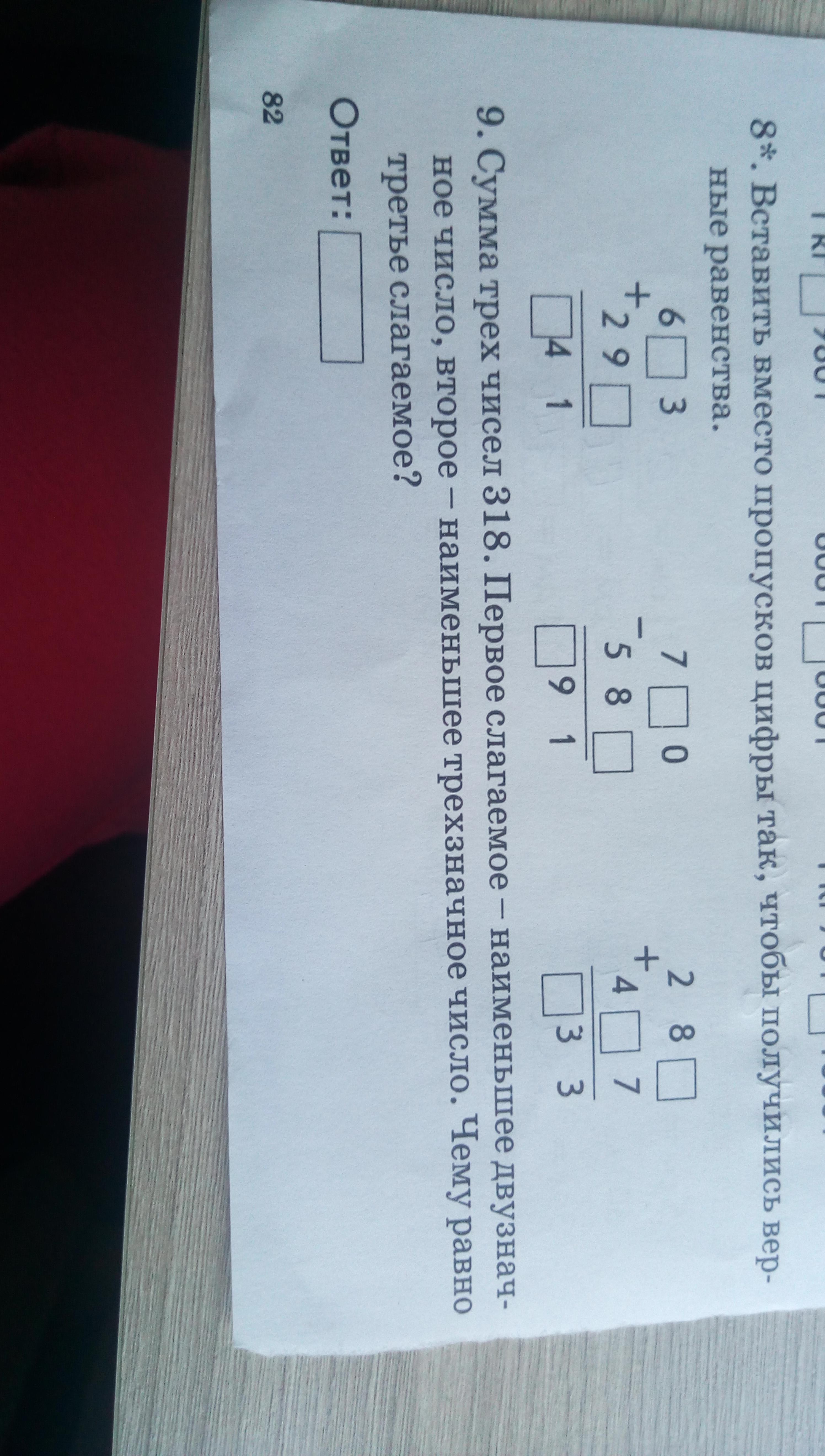 9)Сумма трёх чисел 318. Первое слагаемое - наименьшее двузначное число , второе -наименьшее трехзначное