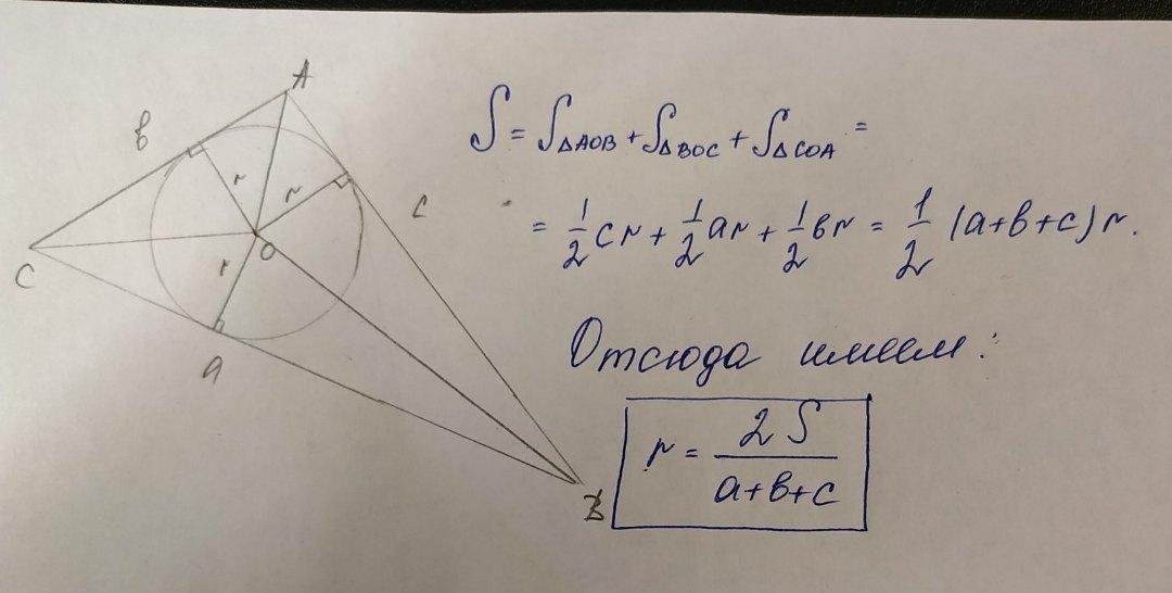 сформулируйте определение окружности вписанного в треугольник и выведите формулу для вычисления радиуса