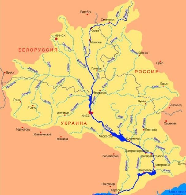 Его притоки : всего насчитывается свыше 420 притоков, наиболее значитильные из них: Друть (правый) , Сож (левый) , Березина (правый) , Припять (правый) , Ирпень (правый) , Сула (левый) , Ворскла (левый) , Орель (левый) , Самара (левый) , Рось (левый) , Базавлук (правый) , Ингулец (правый) , Конка (левый) , Десна (левый) , Псел (левый) , Тетерев (правый).