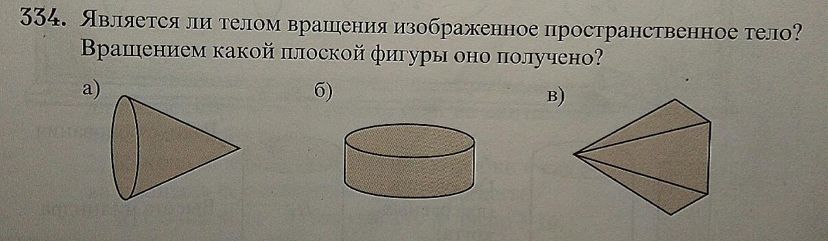Первое тело (конус) получается вращением равнобедренного треугольника вокруг высоты к основанию, второе тело цилиндр - получается вращением прямоугольника, третье тело фигурой вращения не является.