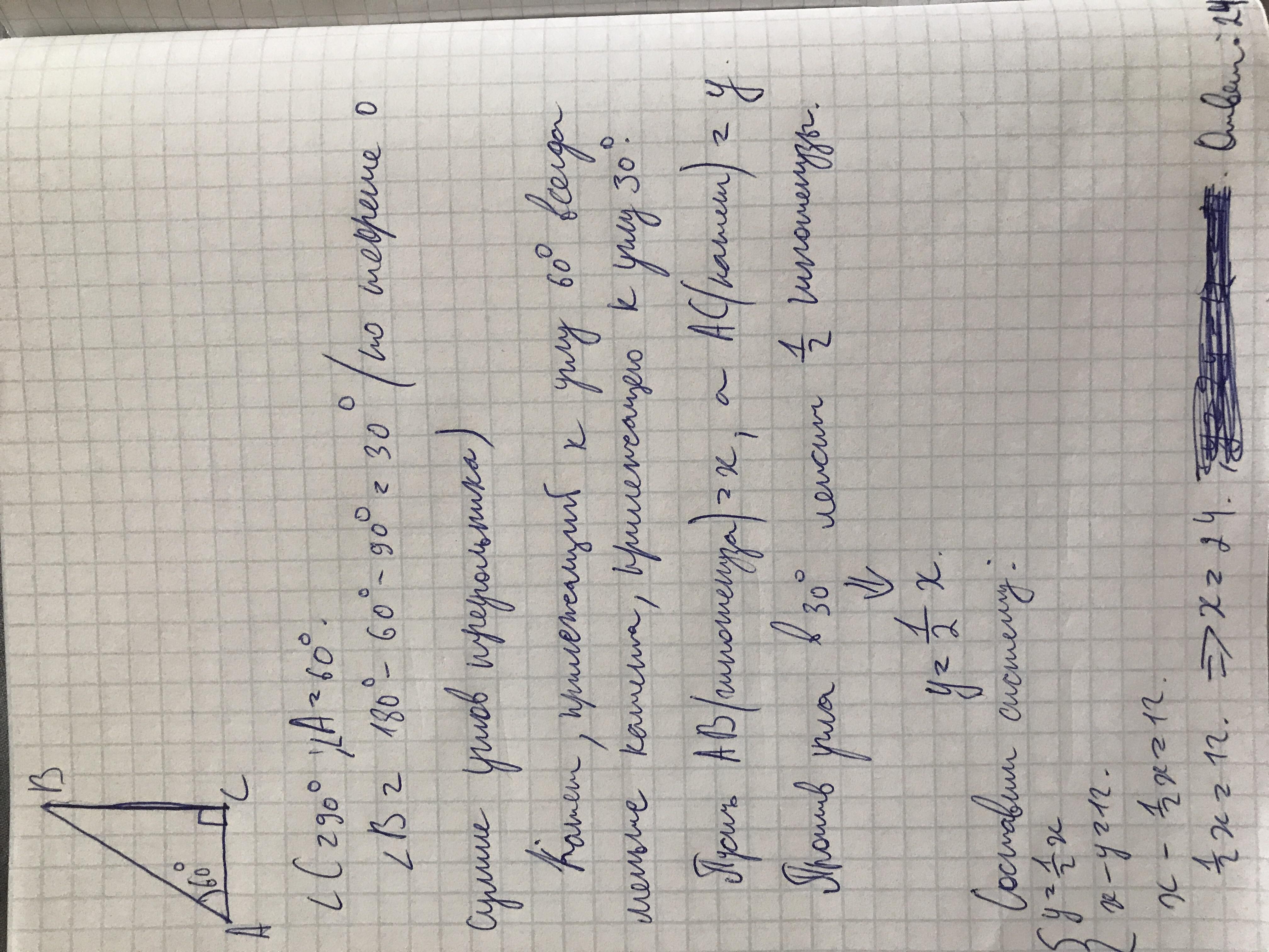 один из углов прямоугольного треугольника равен 60 градусов, а разность гипотенузы и меньшего их катетов равна 12 си. найдите гипотенузу 7 класс