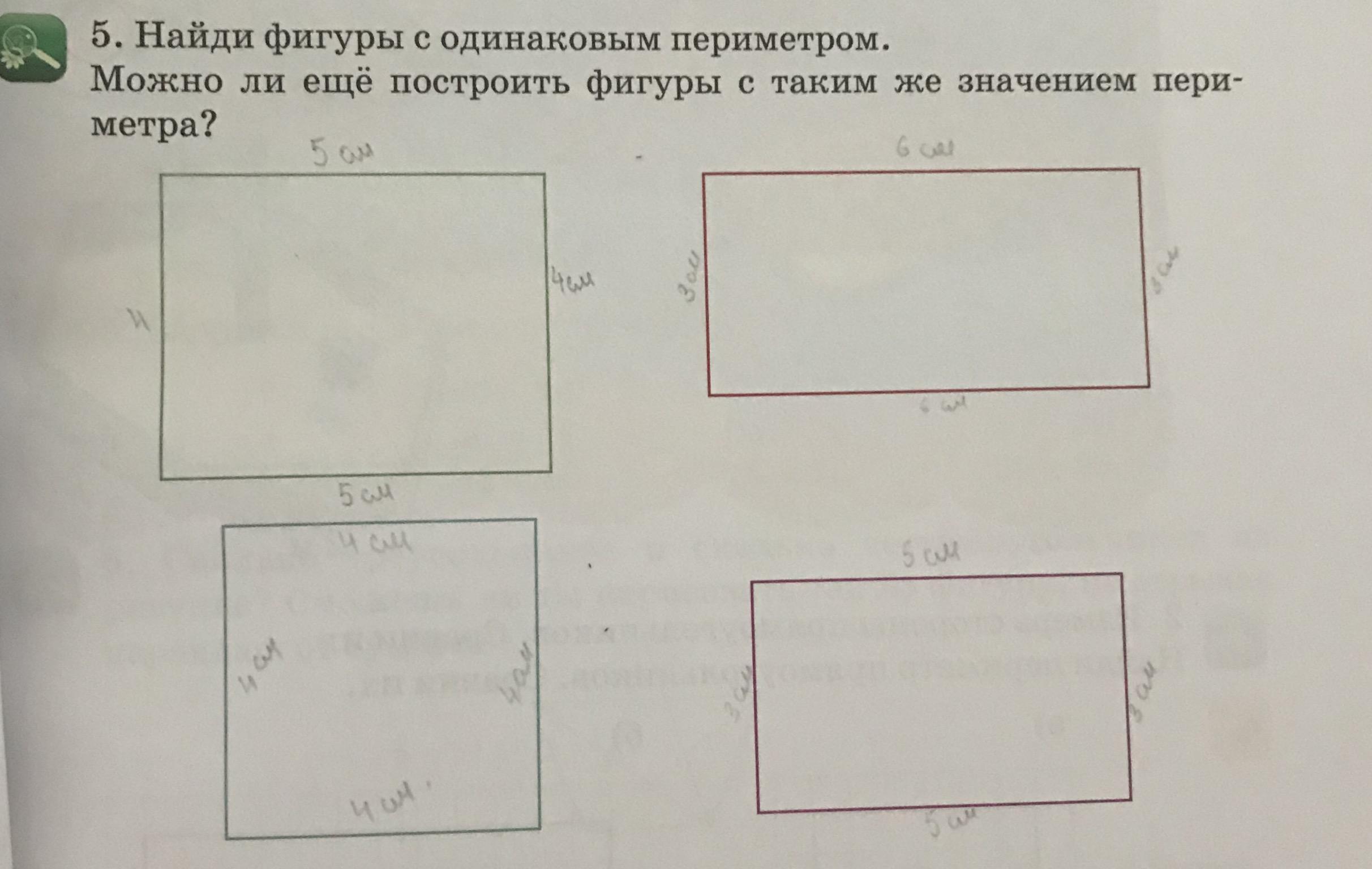 3 и 4 фигуры имеют равный периметр 16 см, можно построить прямоугольники со сторонами 6 и 2 см, 7 и 1 см.