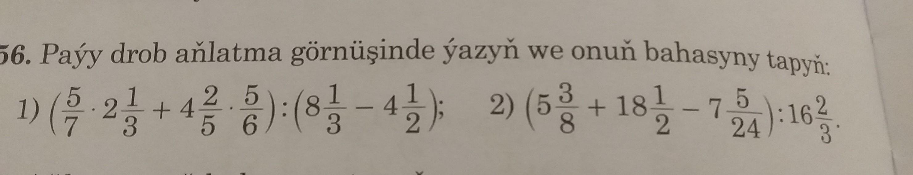1) 5/7 * 2 1/3 = 5/7 * 7/3 = 5/3