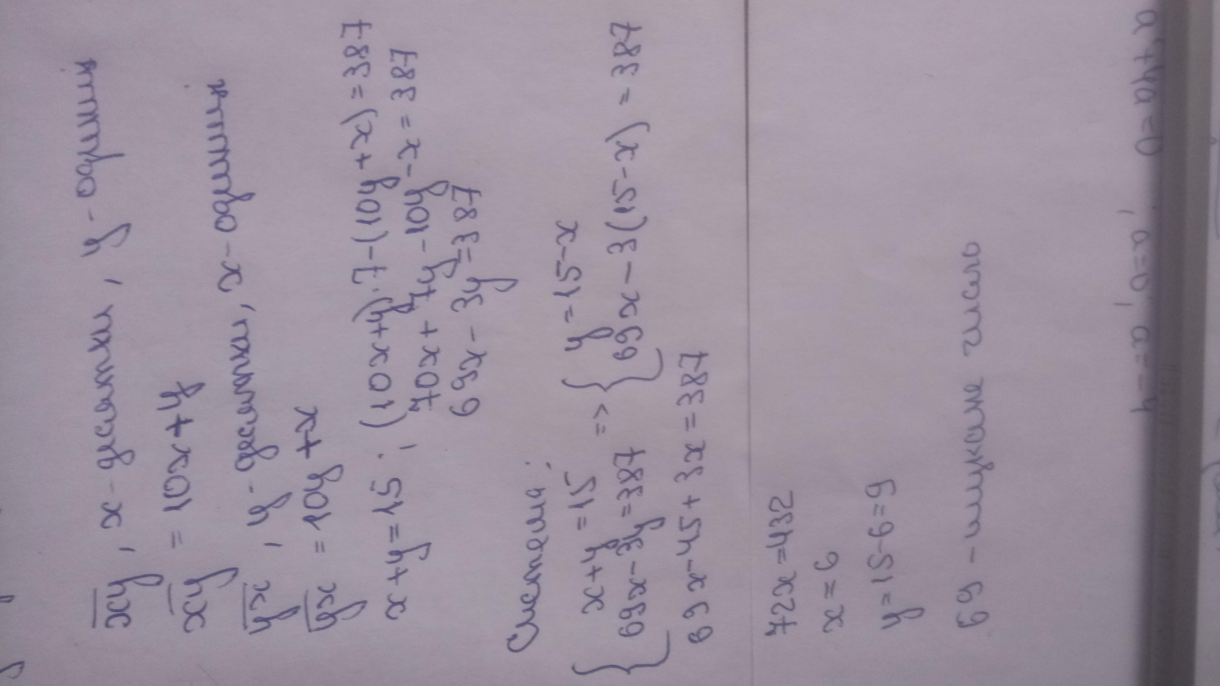 Сума цифр двоцифрового числа дорівнює 15. Якщо це число помножити на 7 і від добутку відняти двоцифрове число, записане тими самими цифрами, що й дане, але у зворотному порядку, то дістанемо 387. Знайдіть двоцифрове число.