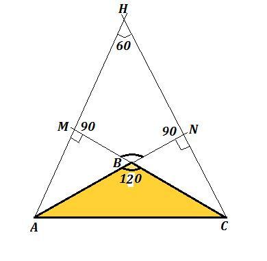 Рассмотрим четырёхугольник MHNB. Сумма углов четырёхугольника равна 360°, причём два угла по 90°, а один угол ∠MBN=∠АВС=120° (углы равны как вертикальные).