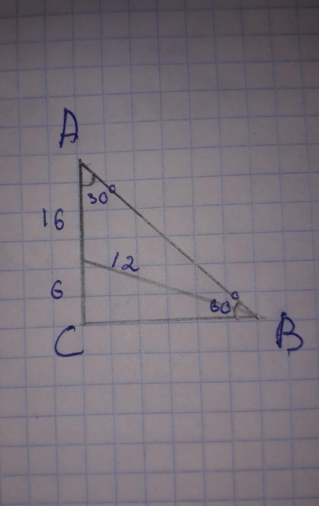 Ответ:CB=6, AC=22, AB=44, т.к. сторона прямоугольного треугольника, лежащая против угла 30°, равна половине гипотенузы.