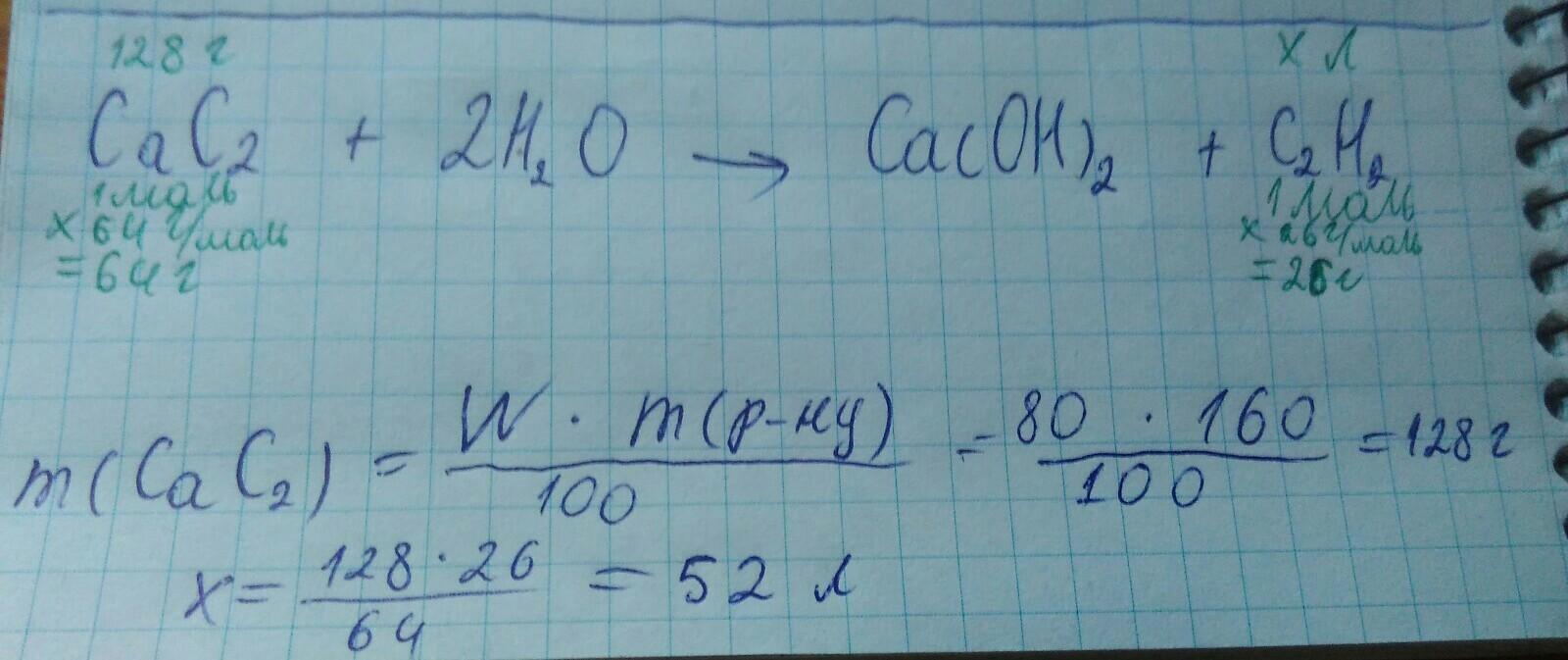 вычислите объем ацитилена,полученного по реакции Ca2+2H2O—Ca(OH2)2+C2H2,если в реакцию вступило 160 г технического карбида кальция(массовая доля CaC2 равна 80 %)