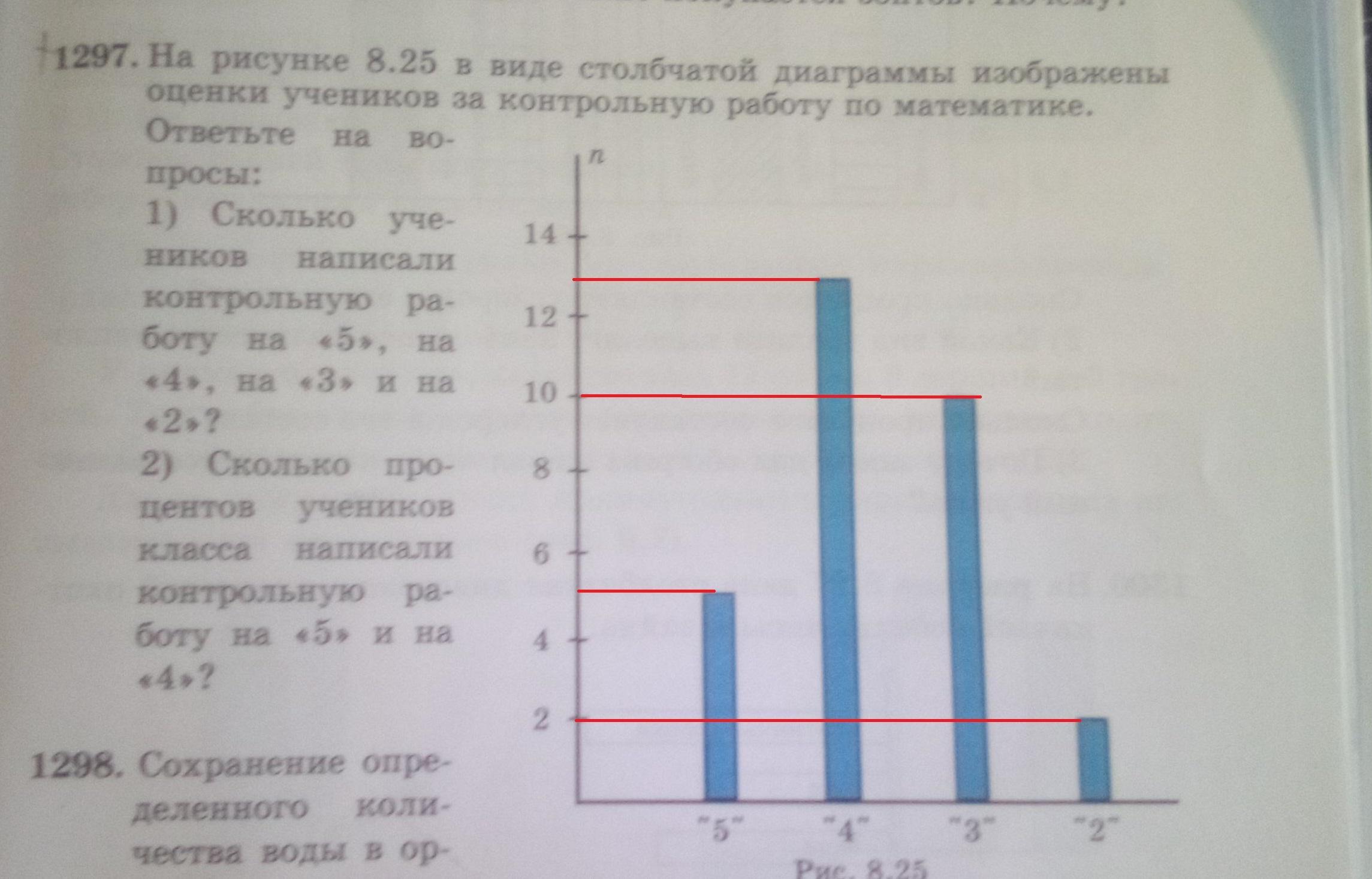На рисунке 8.25 видео столбчатой диаграммы изображены оценки учеников за контрольную работу по математике. Ответьте на вопросы: 1). Сколько учеников написали контрольную работу на 5 ;на 4 ;на 3 и на 2? 2) Сколько процентов учеников класса написали контрольную работу на 5 и на 4?