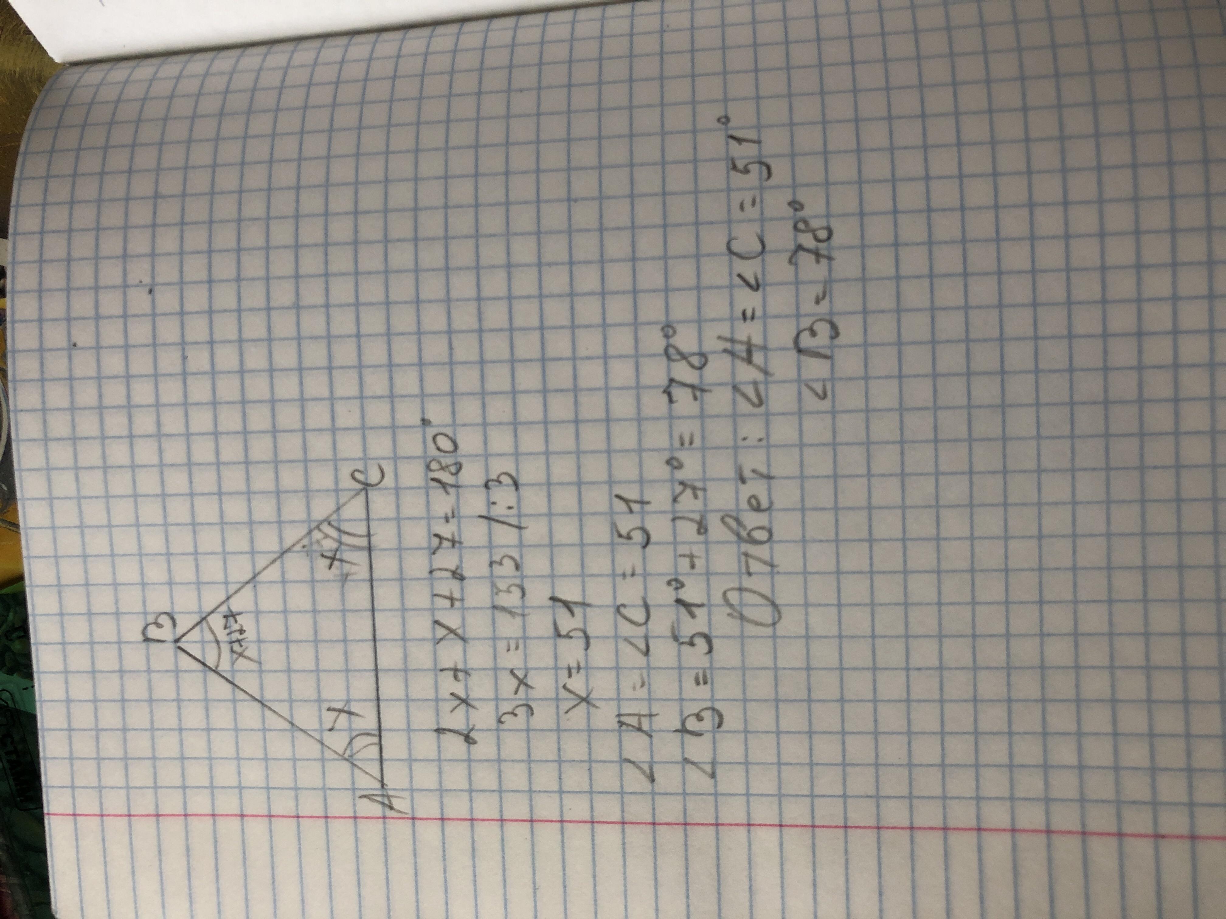 Ответ:Угол В=78°, угол А=углу С=51°.
