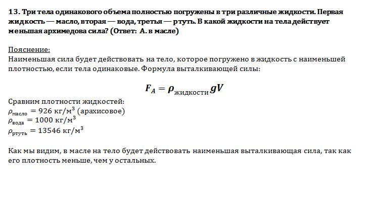 13. Три тела одинакового объема полностью погружены в три различные жидкости. Первая жидкость — масло, вторая — вода, третья — ртуть. В какой жидкости на тела действует меньшая архимедова сила?