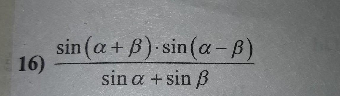 frac{Sin(alpha+beta)*Sin(alpha-beta)}{Sinalpha+Sinbeta} =frac{Cos(alpha+beta-alpha+beta)-Cos(alpha+beta+alpha-beta)}{2(Sinalpha+Sinbeta)}=frac{Cos2beta-Cos2alpha}{2(Sinalpha+Sinbeta)}=frac{1-2Sin^{2}beta-1+2Sin^{2}alpha}{2(Sinalpha+Sinbeta)}=frac{2(Sin^{2}alpha-Sin^{2}beta)}{2(Sinalpha+Sinbeta) }=frac{(Sinalpha+Sinbeta)(Sinalpha-Sinbeta)}{Sinalpha+Sinbeta}=Sinalpha-Sinbeta