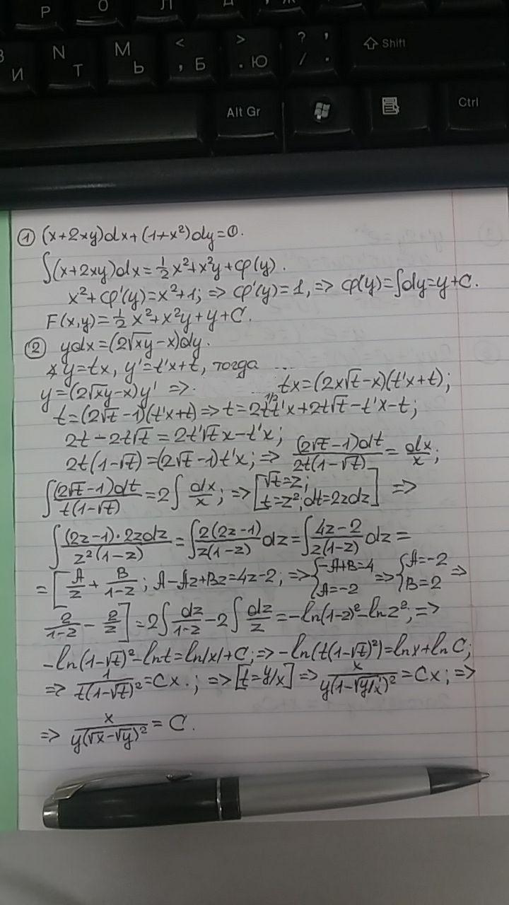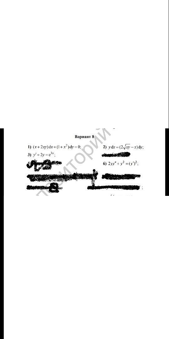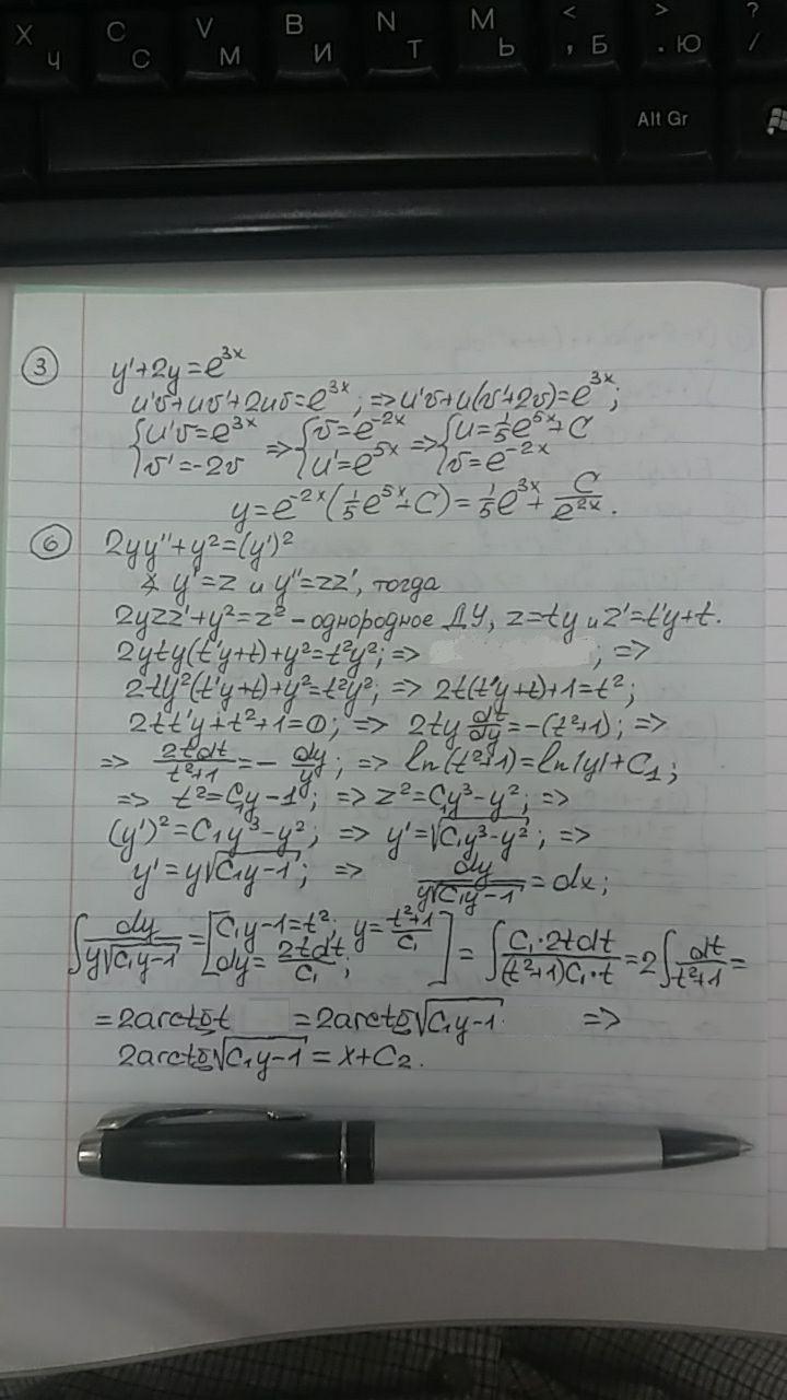 Пояснение: №1 - ДУ в полных дифференциалах; №2 - однородное линейное ДУ; №3неоднородное линейное ДУ; №6 - ДУ, в котором возможно понижение порядка (явно отсутствует переменная "х").