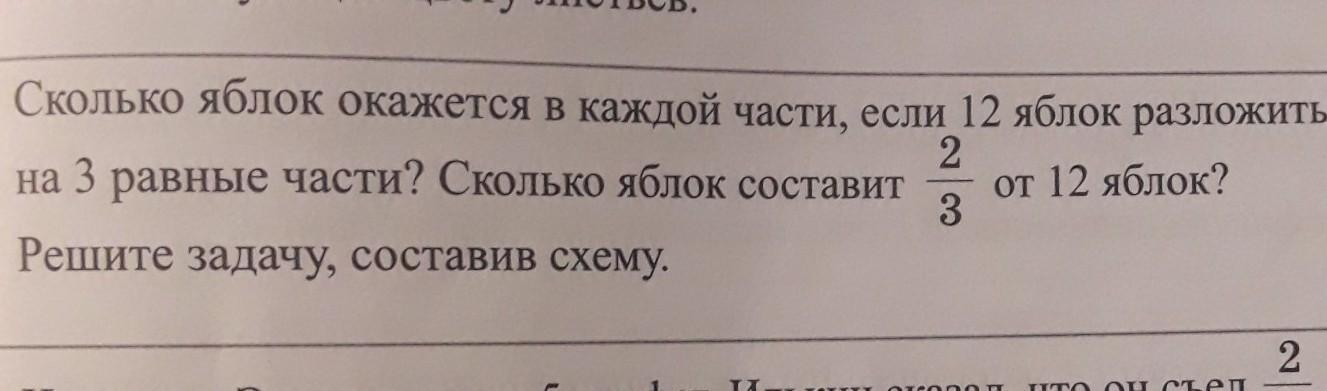 Сколько яблок окажется в каждой части если 12 яблок разложить на 3 равные части? Сколько яблок составит 2/3 от 12 яблок? Решите задачу составив схему.