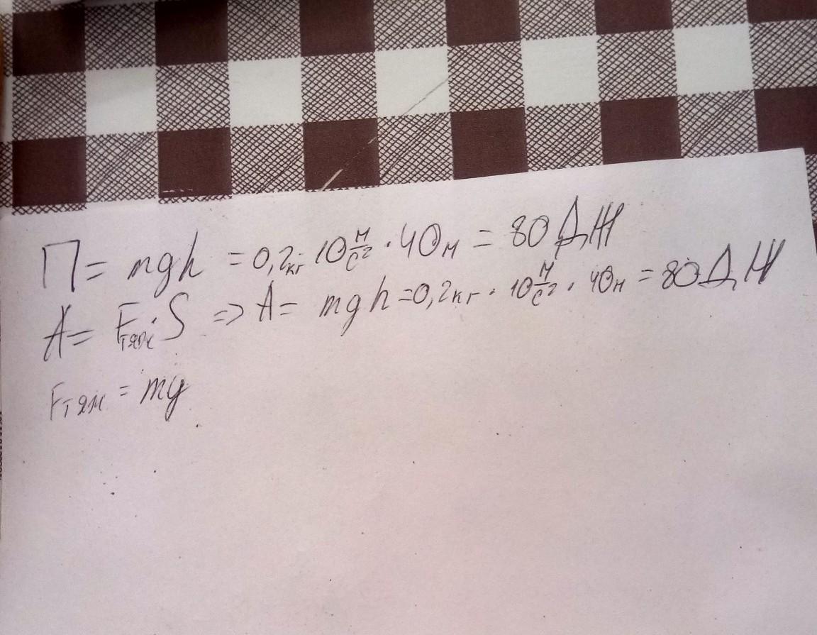 Какой будет потенциальная энергия тело массой 200г на высоте 40м?Какую работу выполнит сила тяжести тела при падении его с этой высоты на землю ?В этой и следующих задача принять g=10м/с^2