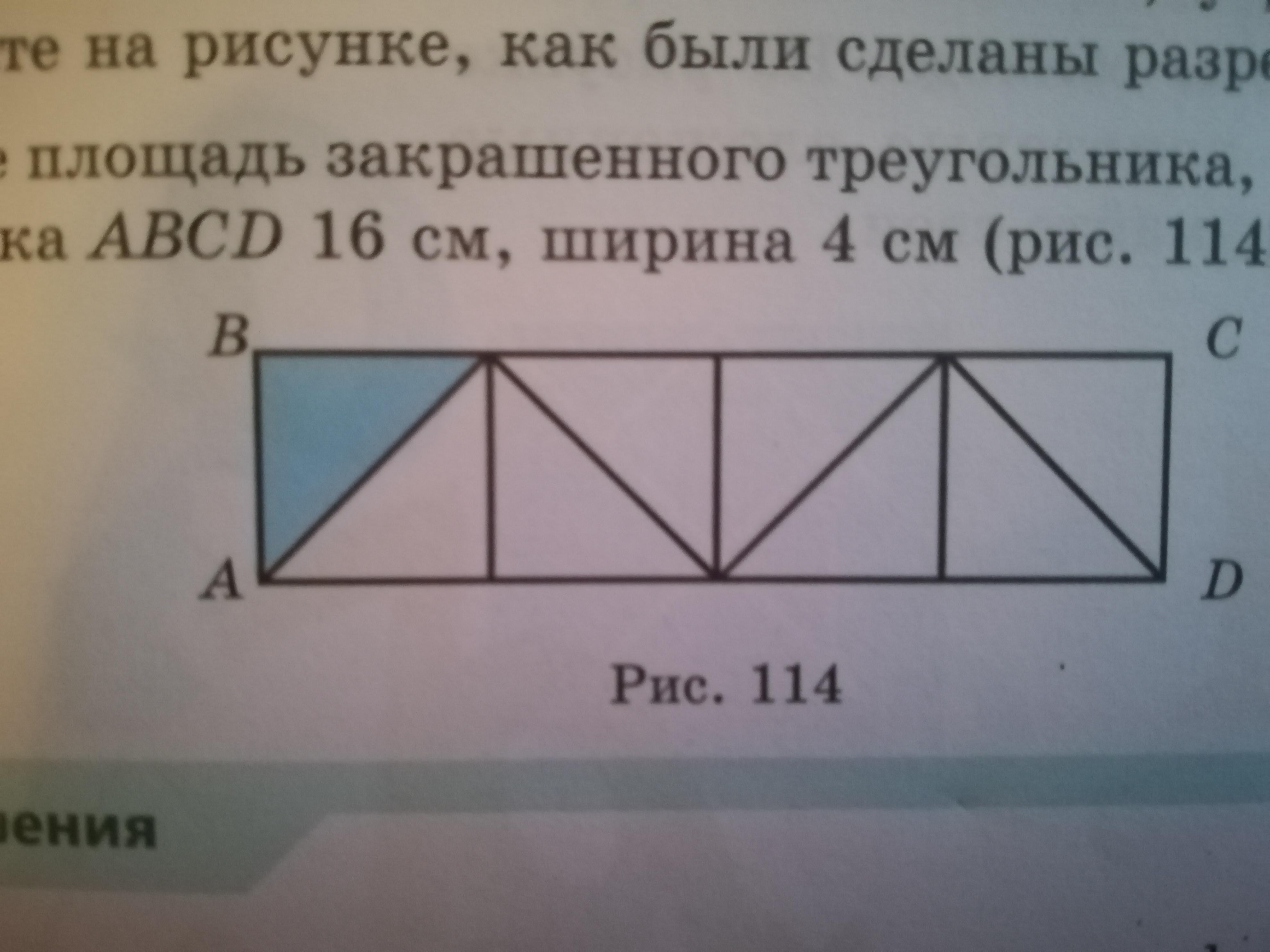 найдите плошать закрашенного треугольника если длина прямоугольника АВСD 16см ширина 4 см