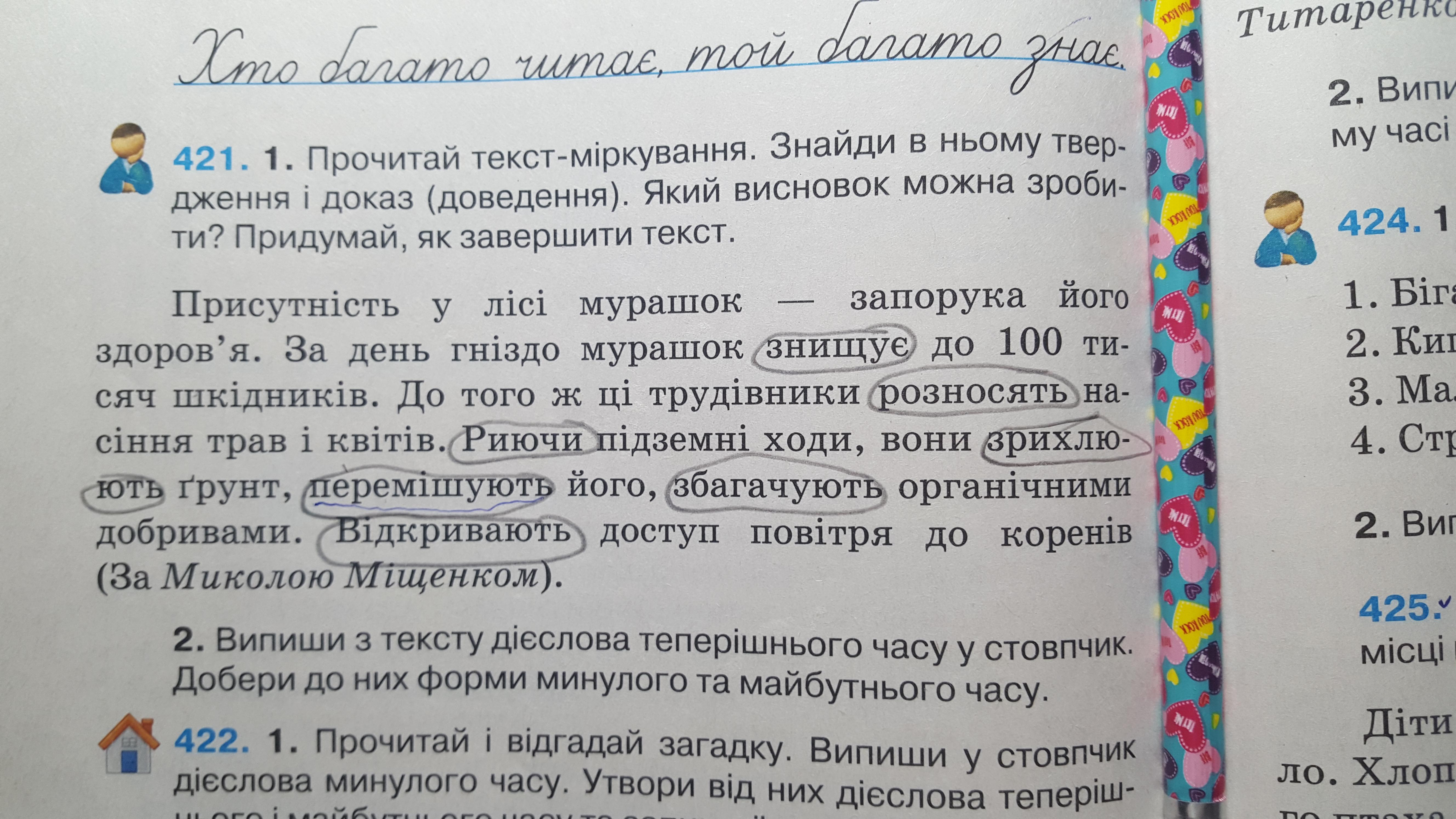 Доказ. За день гніздо мурашок знищує до 100 тисяч шкідників. До того ж ці трудівники розносять насіння трав і квітів. Риючи підземні ходи, вони зрихлюють ґрунт, перемішують його, збагачують органічними добривами. Відкривають доступ повітря до коренів.