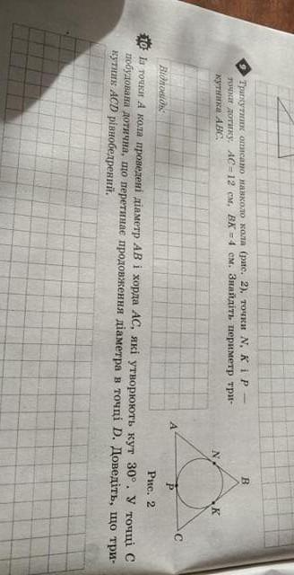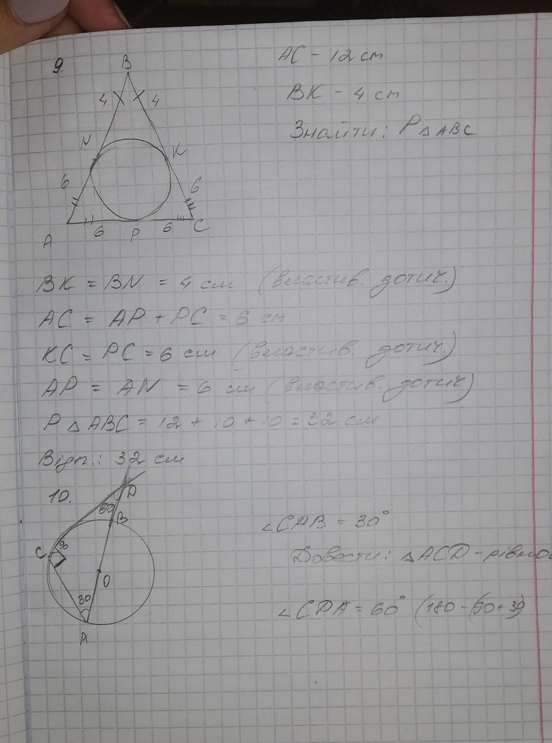 9. По свойству отрезков касательных, проведенных из одной точки к окружности ВК=ВN; NА=АР; СК=СР, пусть СР=СК=х, АР=NА=у, тогда периметр ΔАВС равен АВ+ВС+АС=(4+у)+(4+х)+(х+у)=8+2*(х+у),