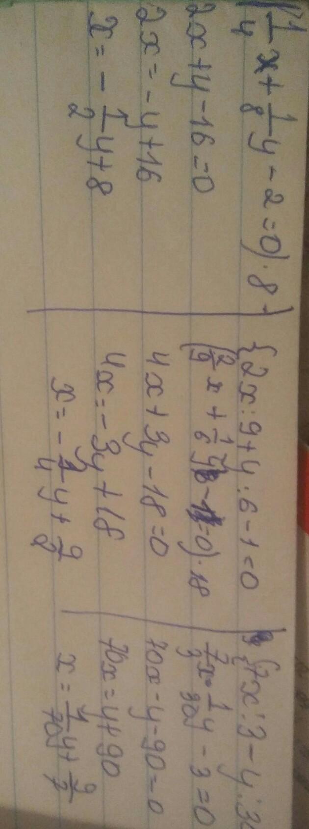 Решите системы уравнений способом постановки. 2) {x/4+y/8-2=0 {2x/9+y/6-1=0 4) 7x/3-y/30-3=0. Помогите пожалуйста даю 40 баллов
