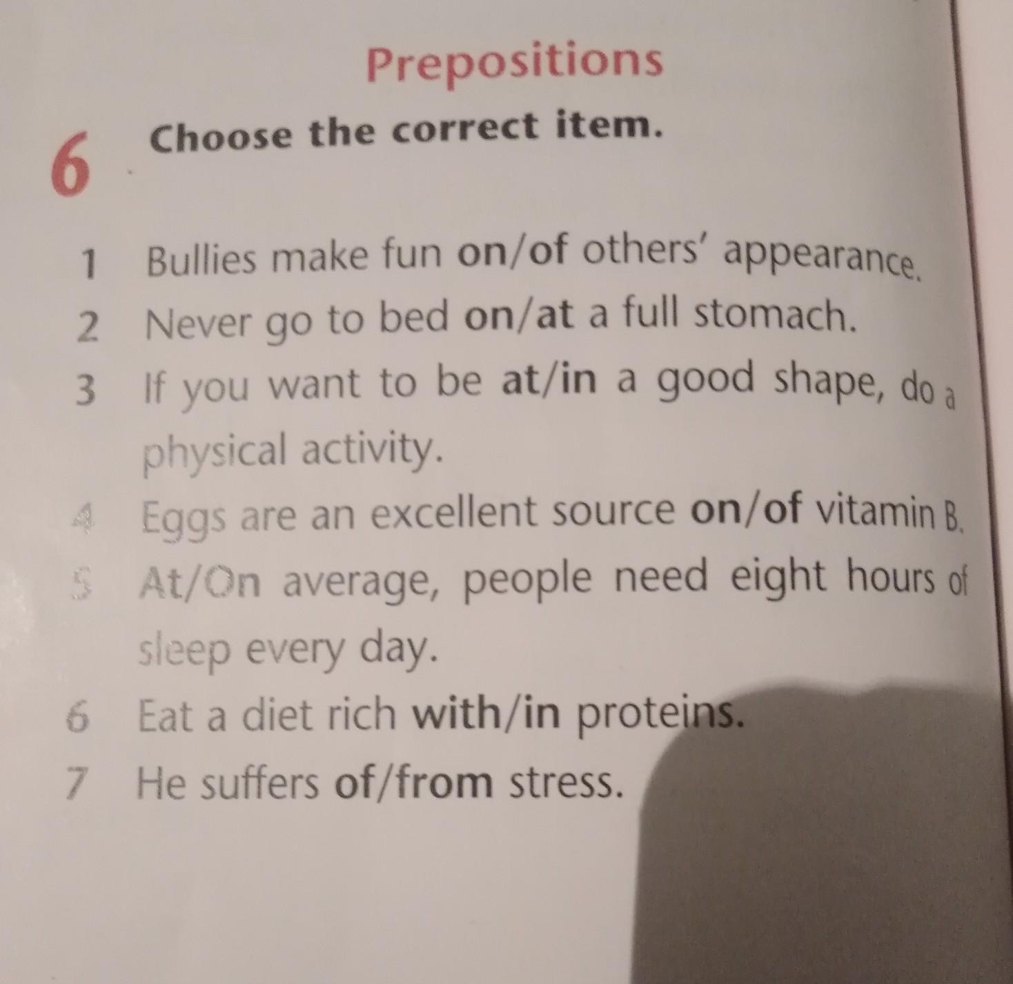 1) of , 2) on - может быть проверь другие ответы 3) in, 4) of, 5) on, 6) with, 7) from . надеюсь помог