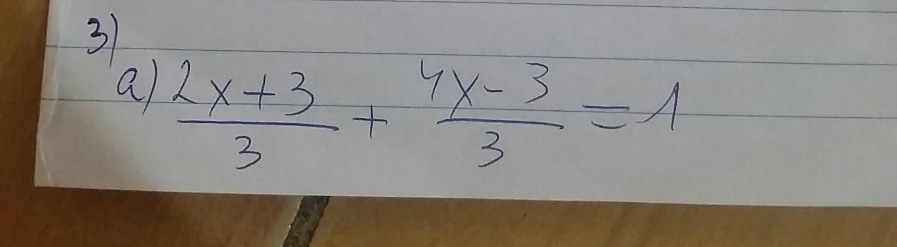 приводим к общему знаменателю 3, получается: 2x + 3 + 4x - 3 = 3. упрощаем: 6x = 3