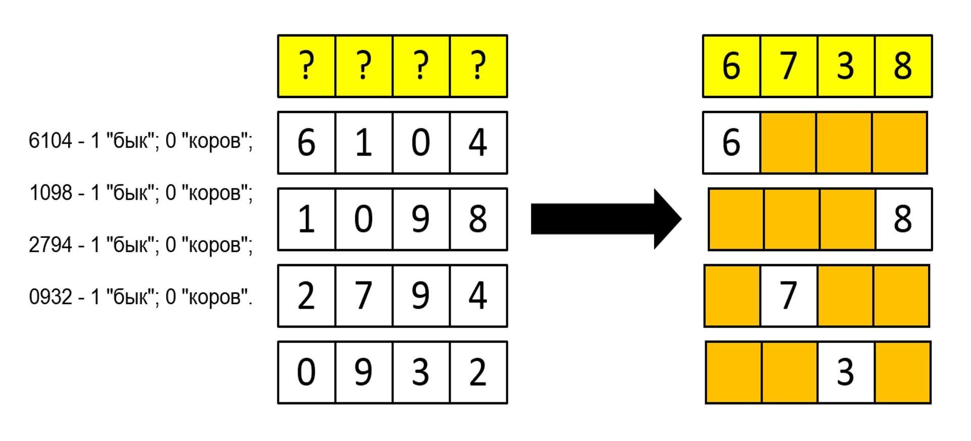 Надо отгадать четыре цифры из десяти 0, 1, 2, ..., 9 и записать их в правильном порядке.