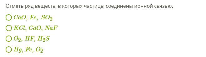 Отметь ряд веществ, в которых частицы соединены ионной связью.
