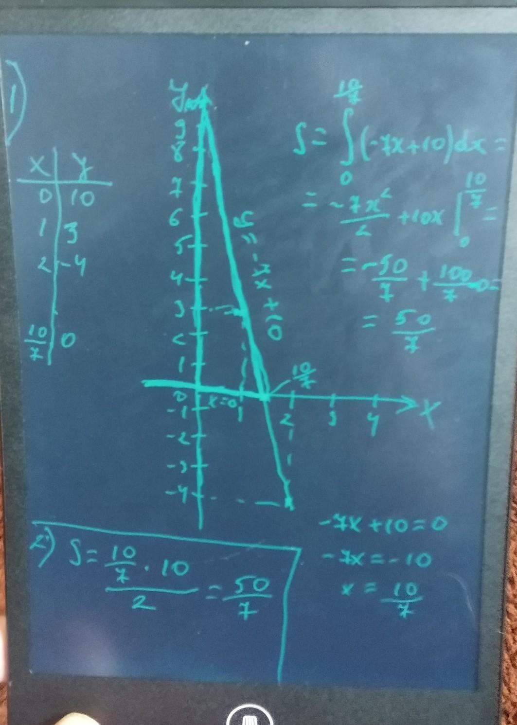 Пошаговое объяснение:после построения прямой при х=0 у=10 и при у=0 х= 10/7 увидим прямоуг. треугольник его S=1/2*10*10/7=50/7