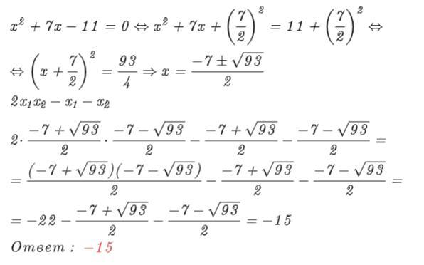 Известно, что x_1 и x_(2 ) – корни уравнения x^2+7x-11=0. Найдите значение выражения 2x_1 x_2-x_1-x_2.