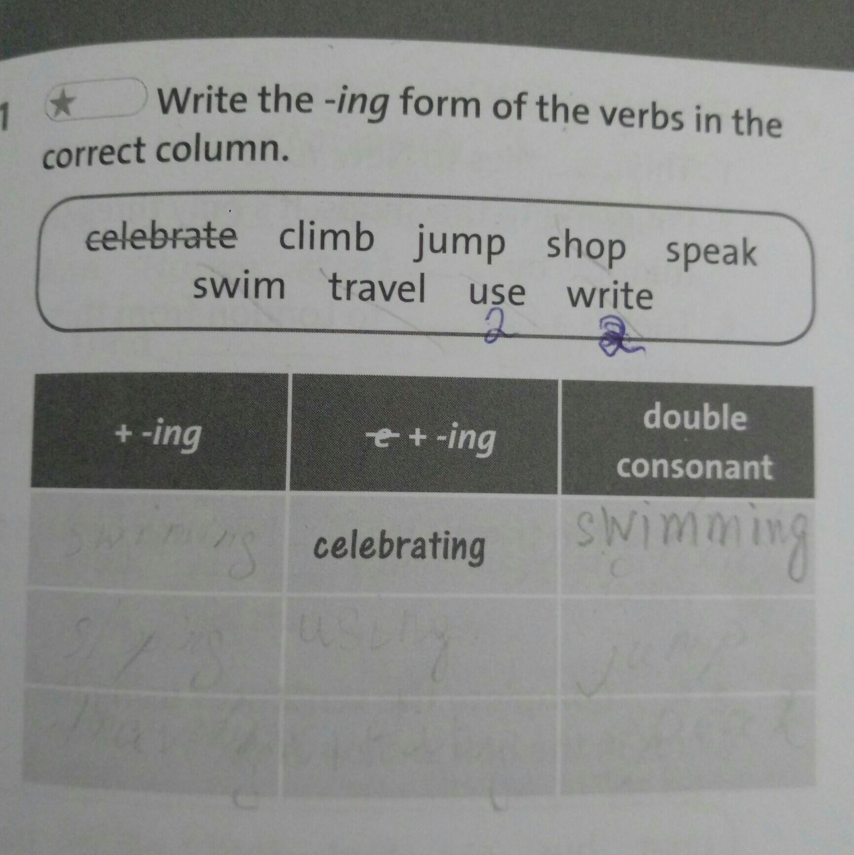 Ответ:1 столбик:jumping,climbing,speaking.2 столбик:writing,using.3столбик:traveling,shopping,swimming.