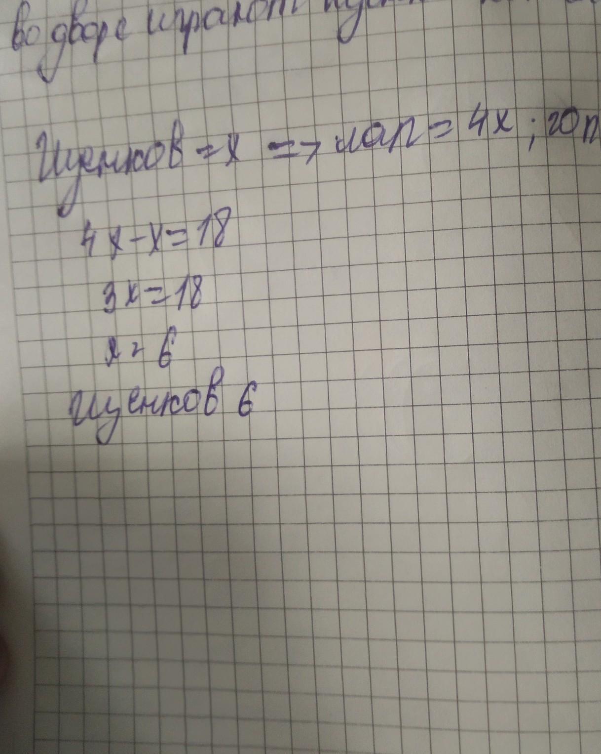 Во дворе играют щенки. Количество их лап на 18 больше, чем количество их голов. Сколько щенков во дворе? помогите пожалуйста срочно