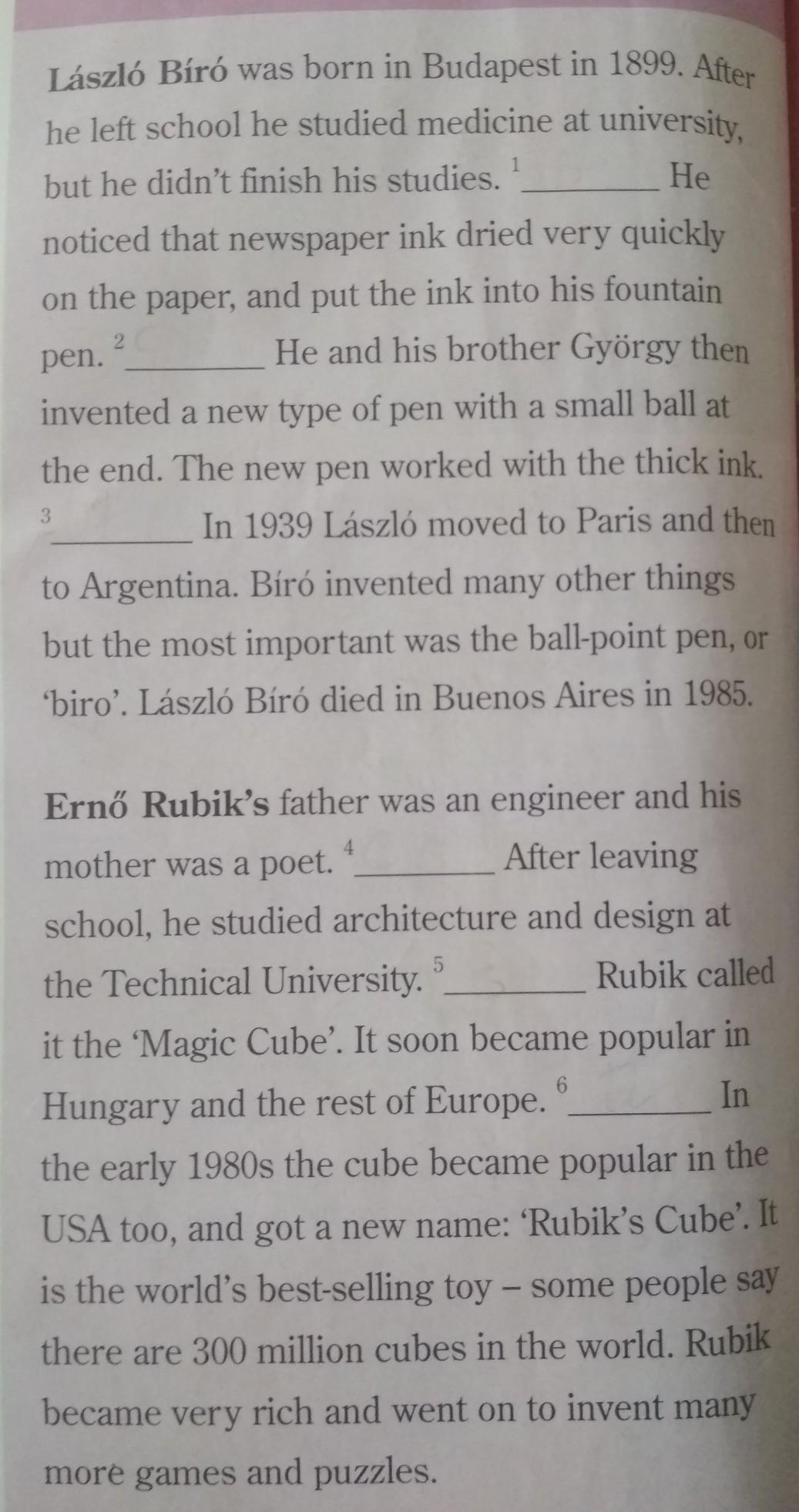 Ласло Биро родился в Будапеште в 1899 году. После окончания школы он изучал медицину в университете, но не закончил учебу. Он заметил, что газетные чернила очень быстро высохли на бумаге, и положил чернила в свою авторучку. Затем он и его брат Дьёрдь изобрели новый тип ручки с маленьким шариком в конце. Новая ручка работала густыми чернилами. В 1939 году Ласло переехал в Париж, а затем в Аргентину. Биро изобрел много других вещей, но самой важной была шариковая ручка или биро ». Ласло Биро умер в Буэнос-Айресе в 1985 году. Отец Эрно Рубика был инженером, а мать - поэтом. После окончания школы он изучал архитектуру и дизайн в Техническом университете. это волшебный куб ». Вскоре он стал популярным в Венгрии и в остальной части Европы ». В начале 1980-х куб стал популярным и в США, и получил новое имя:« Кубик Рубика ». Я - самая продаваемая игрушка в мире - некоторые люди говорят, что есть 300 миллионов кубов в мире. Рубик стал очень богатым и продолжил изобретать еще много игр и головоломок.