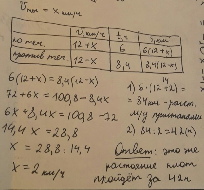 Моторная лодка собственная скорость которой 12 км в час прошла по течению реки расстояние между пристанями за 6 часов обратный путь она совершила за 8,4 часа. За сколько времени пройдёт Это же расстояние плот пущенной по течению реки?
