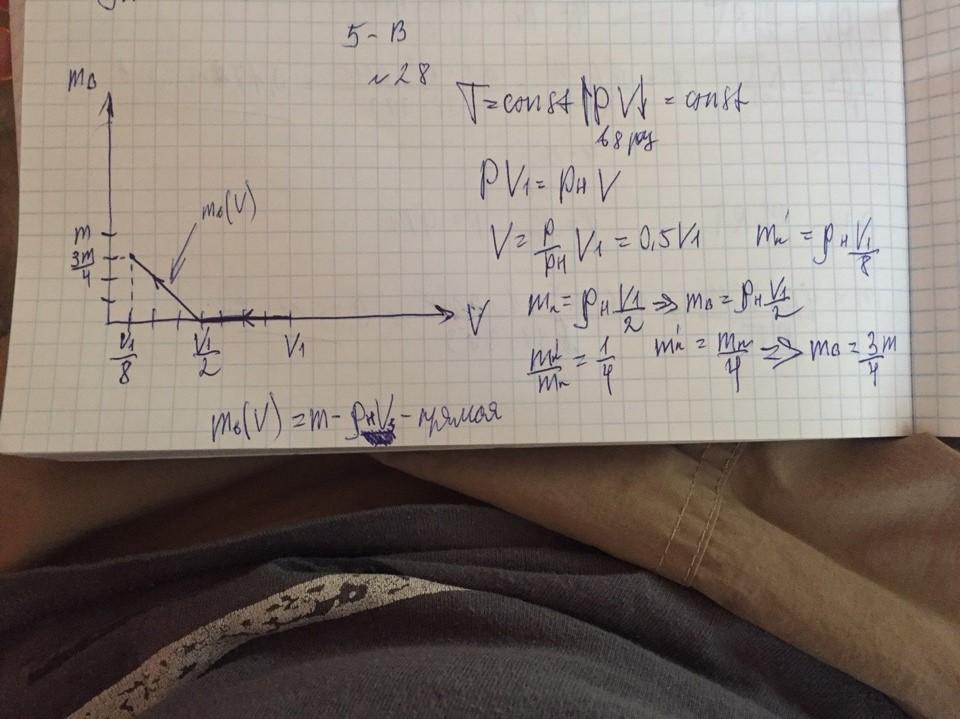 Здравствуйте, пытаюсь решить такую задачу: В сосуде, закрытом поршнем, находится при комнатной температуре воздух, относительная влажность которого равна 50%, а масса пара равна m. Поршень медленно вдвигают в сосуд, уменьшая его объём в 8 раз, при постоянной температуре. Нарисуйте график зависимости массы воды, сконденсировавшейся в этом процессе, от объёма сосуда.