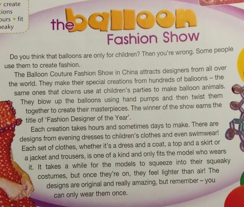 Показ моды "Воздушный шар" в Китае привлекает дизайнеров со всего мира. Они делают свои особые творения из сотен воздушных шариков-те же самые, которые клоуны используют на детских вечеринках, чтобы сделать фигуры животных. Они надувают воздушные шары с помощью ручных насосов, а затем скручивают их вместе, создавая свои шедевры. Победитель шоу зарабатывает титул "Модельера года".