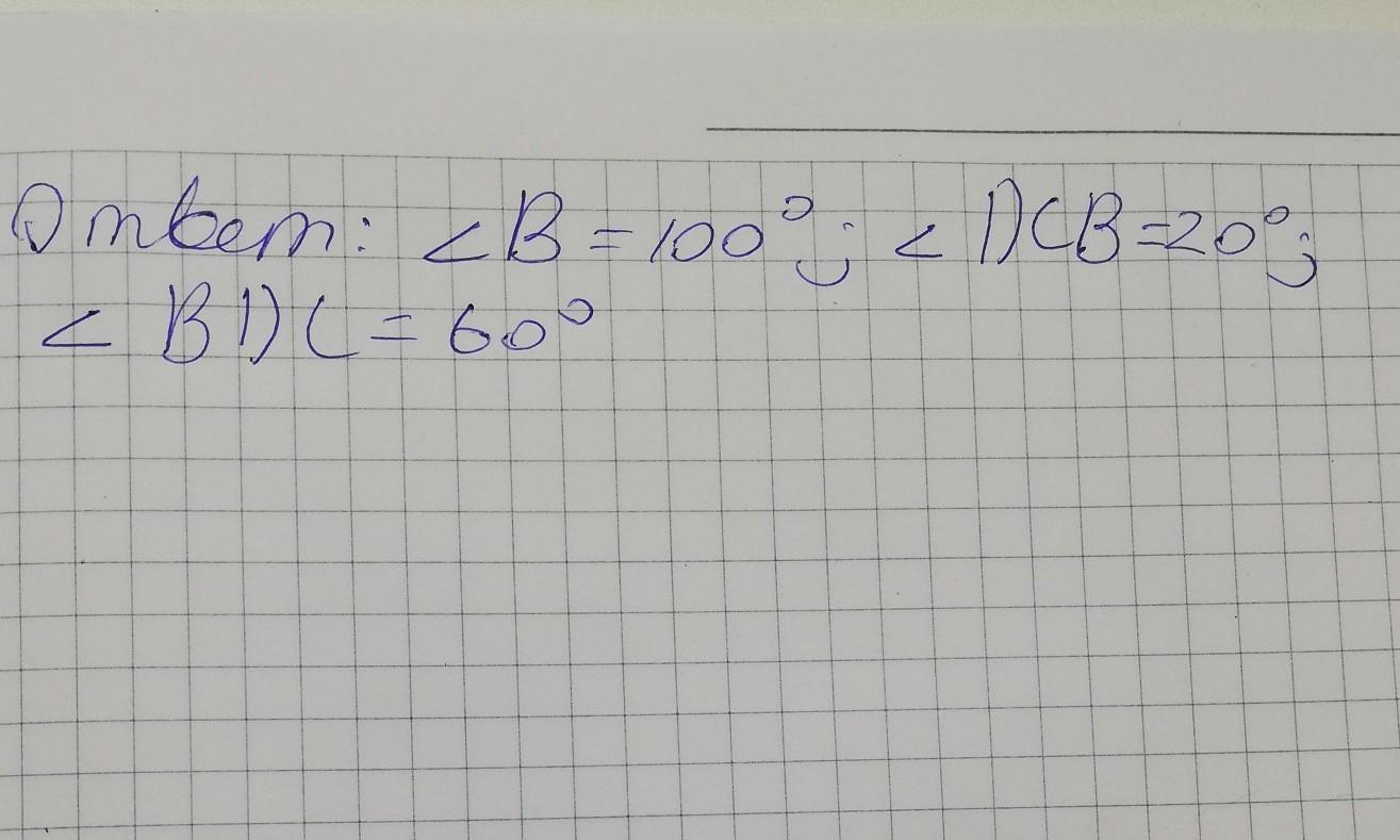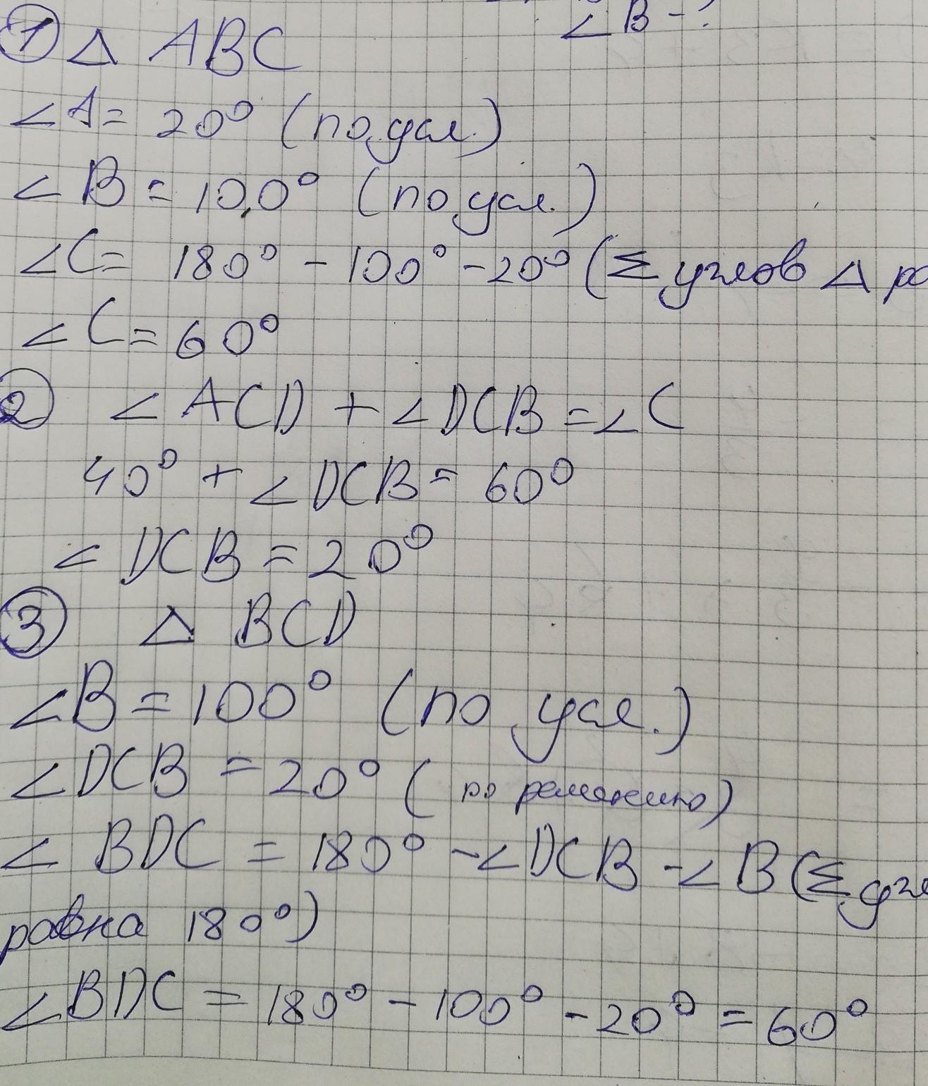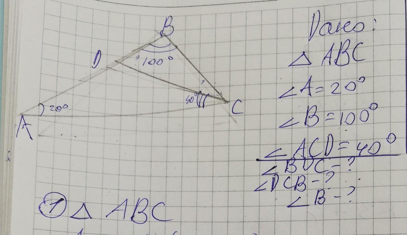 В треугольнике ABC угол A равен 20°, угол B равен 100°. На стороне AB отмечена точка D так, что угол AСD равен 40° Найдите углы треугольника BCD. Помогите пожалуйста. С чертежом, дано и решением.