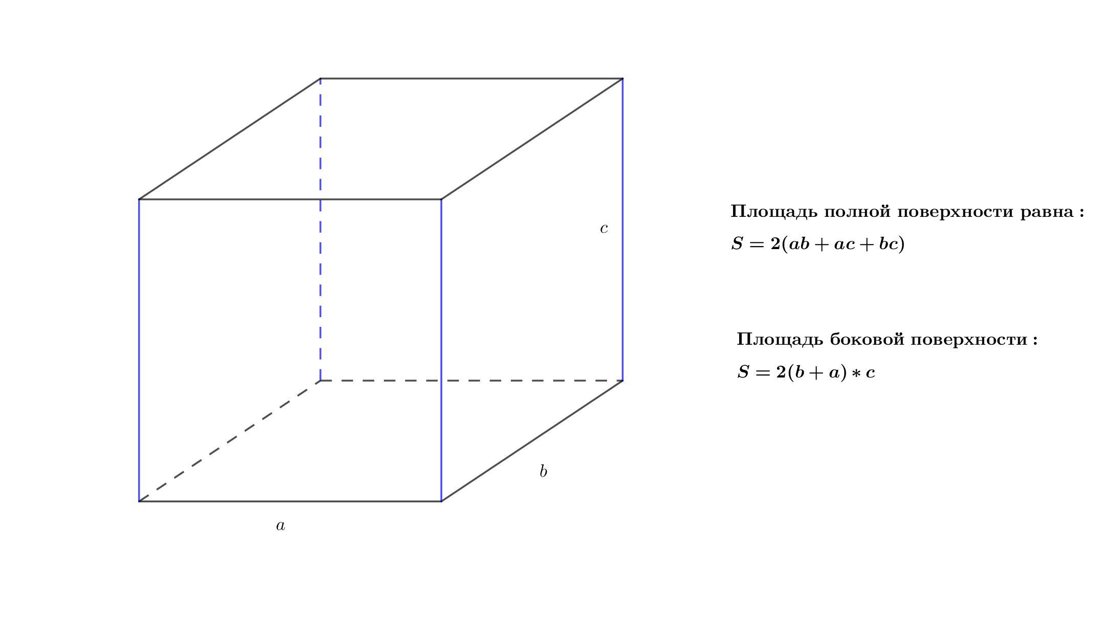 Обозначив длину, высоту и ширину прямоугольного параллелепипеда буквами a, b, c, выразите в виде формулы сумму площадей её оснований, площадь боковой поверхности.