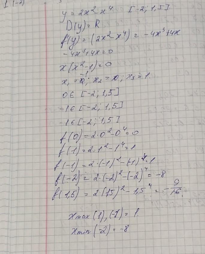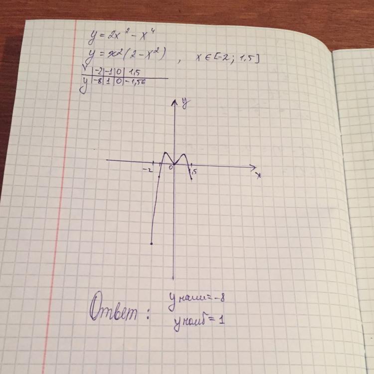 77 баллов!найти наибольшее и наименьшее значение функции на отрезке:у=2х^2-х^4 при [-2;1.5]