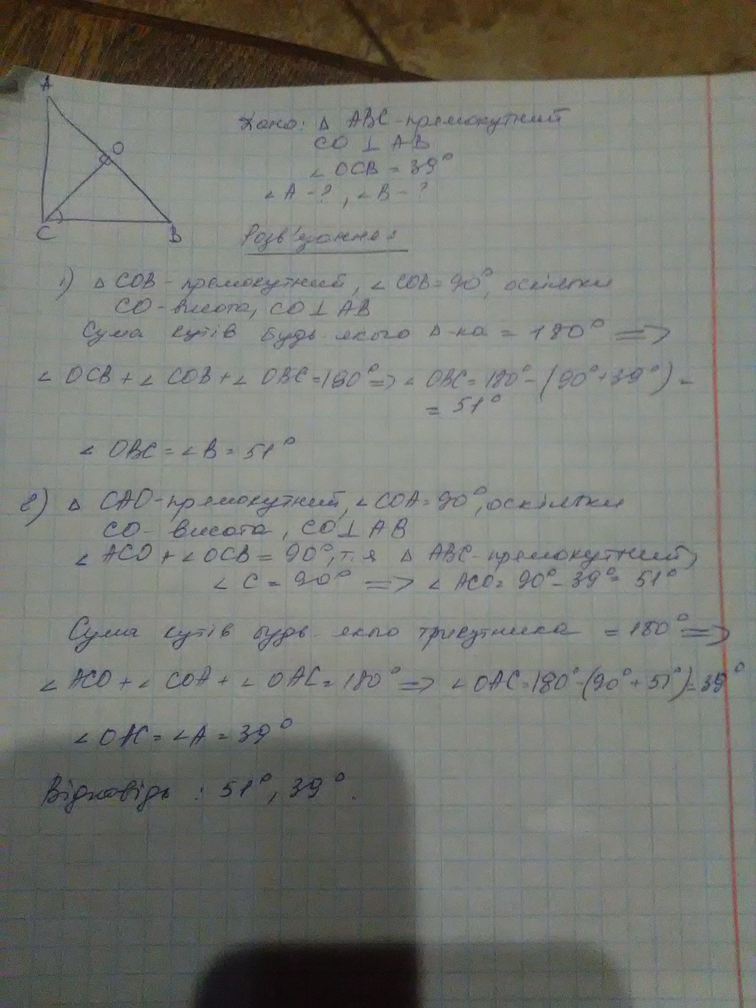 СРОЧНО)Кут, який утворює висота прямокутного трикутника з одним із катетів,дорівнює 39°.Знайти гострі кути прямокутного трикутника.(Решение з дано, рисунком, и з полным объяснением пж)