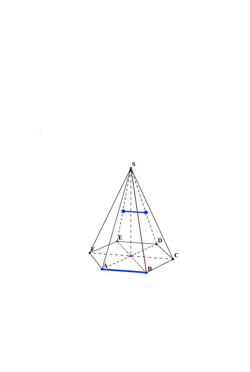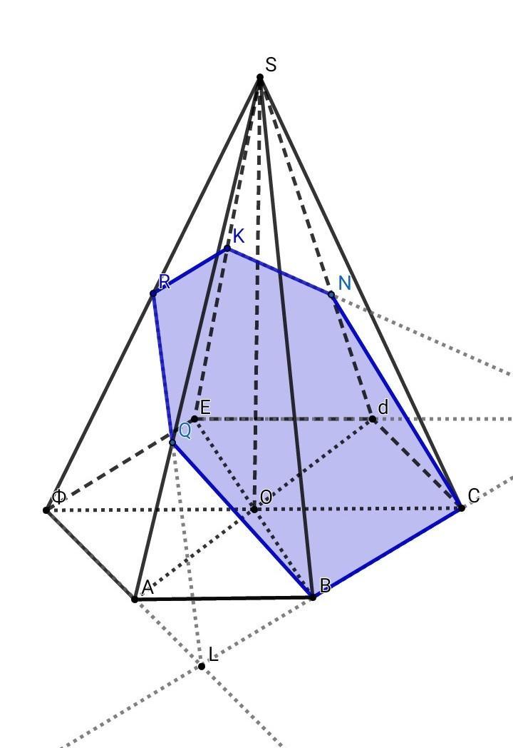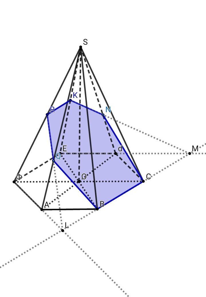 Правильная шестиугольная пирамида. Через одну из ее сторон проведена плоскость, делящая ребра противоположной грани пополам. Постройте это сечение.