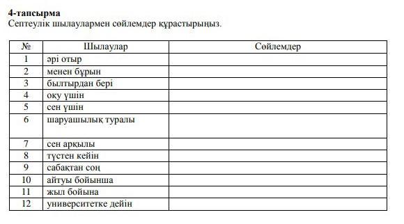 Кішкене әрі отыршы. Ол менен бұрын келіп үлгеріпті. Мен былтырдан бері футбол үйірмесіне барып жүрмін. Жақсы оқу үшін сабаққа ынта мен ықылас қажет. Сен үшін мен кіммін? Біз бүгін шаруашылық жайлы сөйлестік. Сен арқылы бақылау жұмысынан бестік аламын. Түстен кейін мектепте олимпиада болады ма? Мұғалім бізге үнемі сабақтан соң бірден үйлеріңе қайтыңдар дейді. Асқардың айтуы бойынша, ол ауырып қалыпты. Жыл бойына сабақтар дұрыс өтпеді. Университетке дейін мен музыка мектебіне барғанмын.