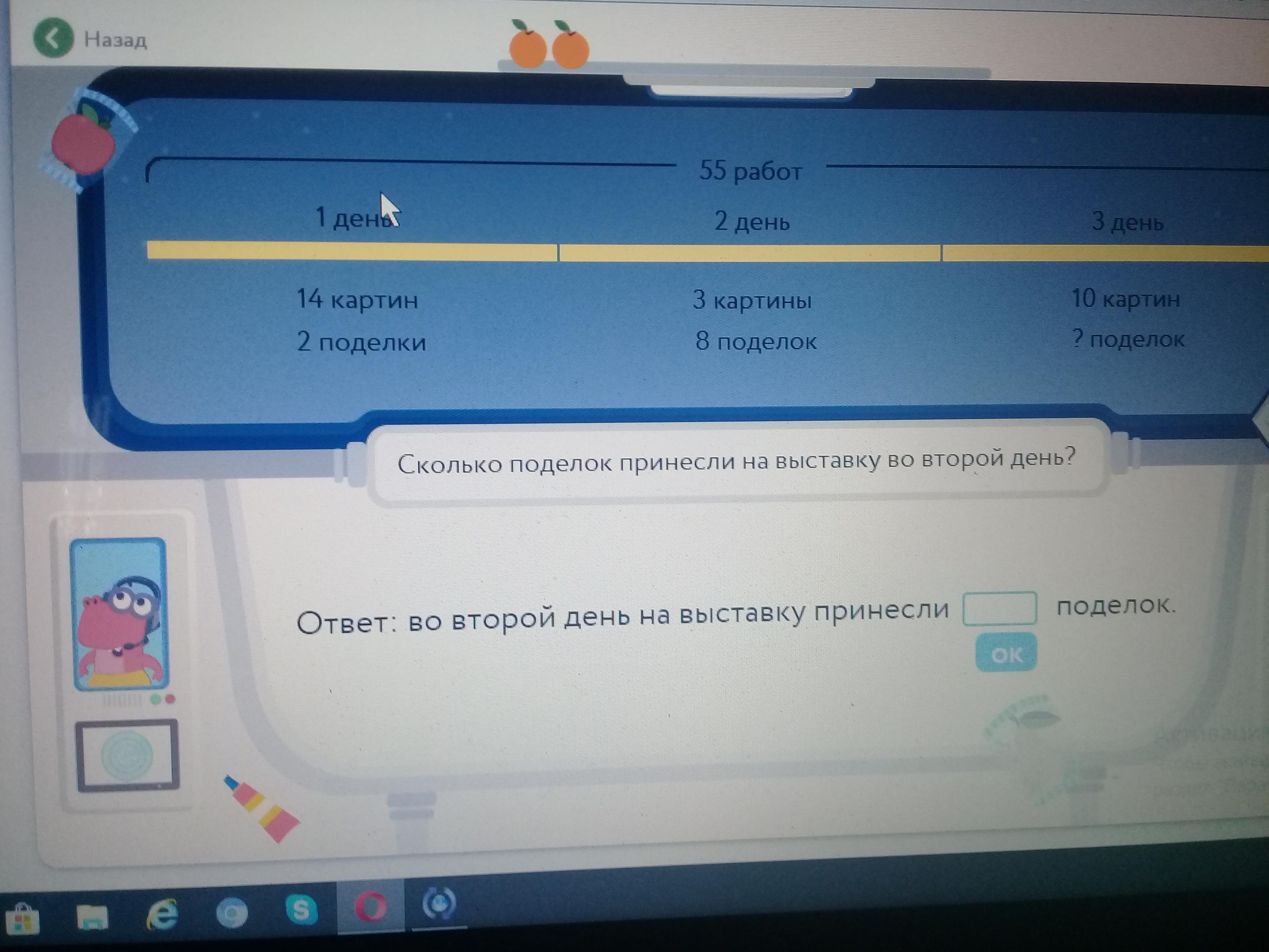 Там какая-то ошибка,написано,что надо узнать сколько всего принесли поделок во второй день,хотя там уже написано,что принесли 8 поделок,ну я про третий день на всякий случай сделала,ну а так пиши:8 поделок всего сделали во второй день.