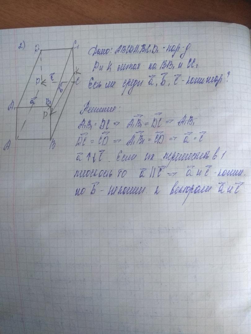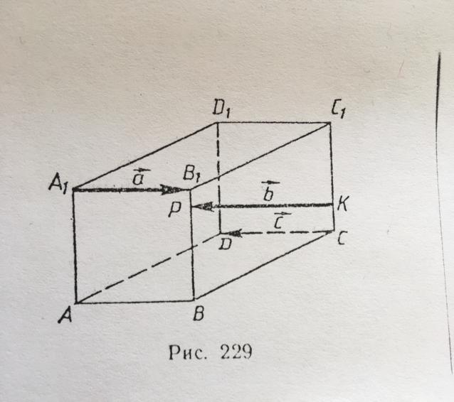 Точки P и K лежат на рёбрах ВВ1 и СС1 параллелепипеда АВСDA1B1C1D1. Есть ли среди векторов а, в, с коллинеарные(рис.229)?